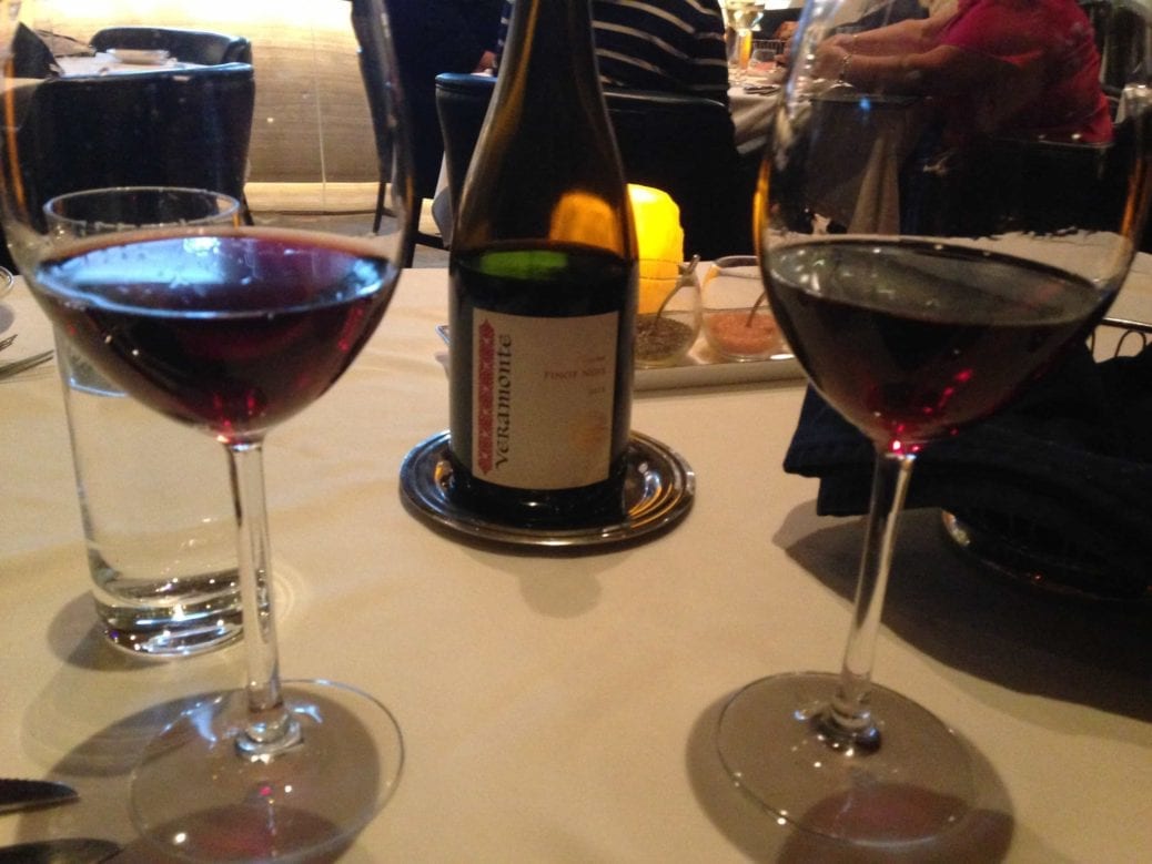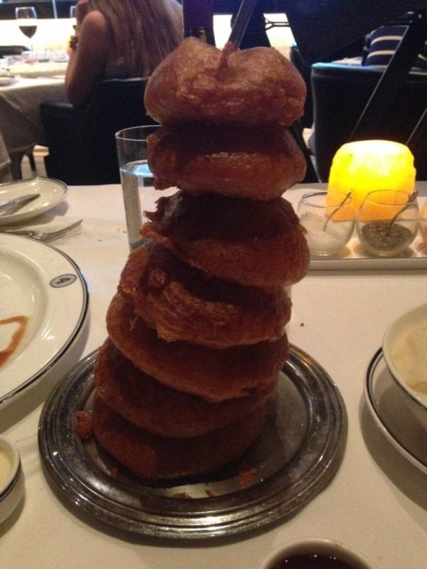 We ordered a delicious bottle of Pinot Noir and Blue Point oysters (yum)! Not to mention the onion rings (which were as big as glazed donuts, I’m not kidding- see the photo below). The previously mentioned garlic mashed potatoes and split a 12 oz New York Strip (cooked medium rare and dry aged for 21 days).