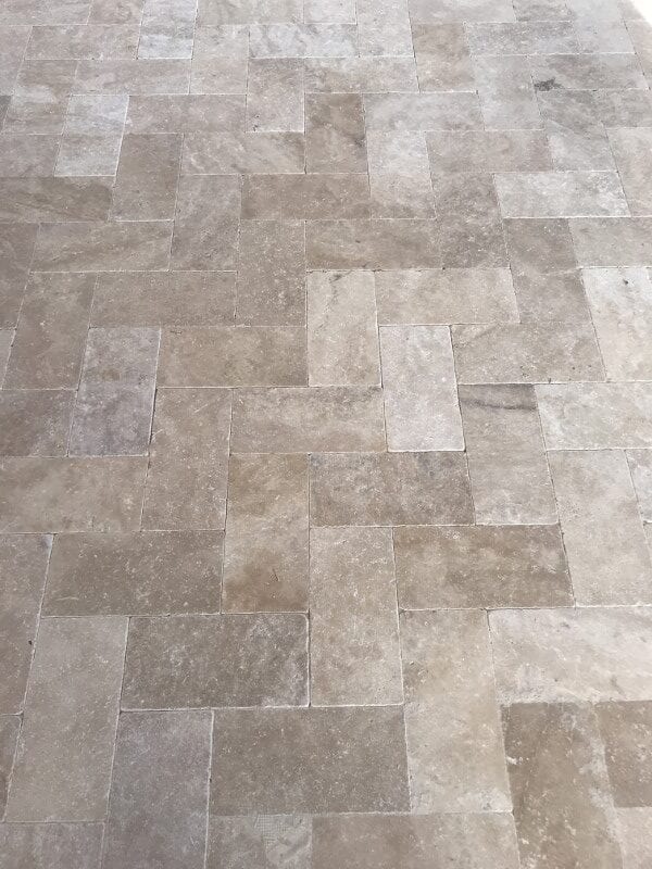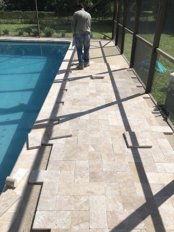 Travertine (yep, we’re so Boca) was our material of choice and we chose to have it installed in a herringbone pattern RIGHT ON TOP of the existing deck. The coping is cemented over the edge of the pool and the rest of the pavers are secured in the pattern over modeling sand. That way, if one sinks or moves out of place, you can simply pull it out, smooth out the sand and put it back.