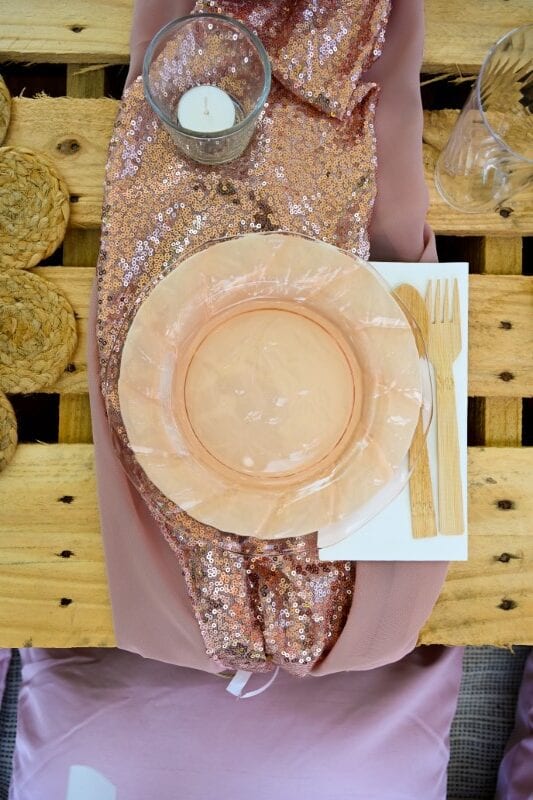 To get started, I layered two table runners in two different styles from Amazon (3 sequin rose gold and 3 chiffon dusty rose) one on top of the other along the entire center area of the shipping pallets. It looks better if it’s a little messy/draped.