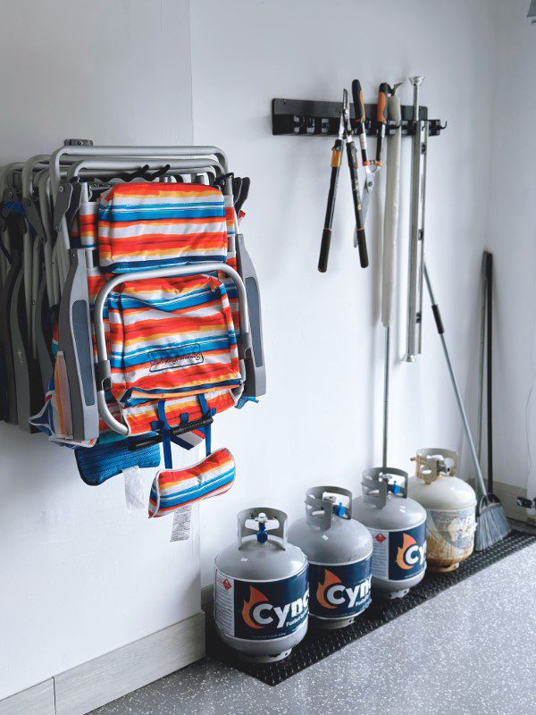 Pegboard and Hooks and Tool Mount: These were perfect for organizing small tools and this amazing Ryobi Blower, keeping them easily accessible yet out of the way. We also installed this wall-mounted storage rack for other items like our broom, garden shears and flags.