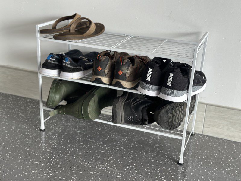 Shoe Storage Rack: Adding a shoe rack near the entrance of the garage keeps dirt from trekking into the house and provides a convenient place for my husband to store a lot of his outdoor footwear.