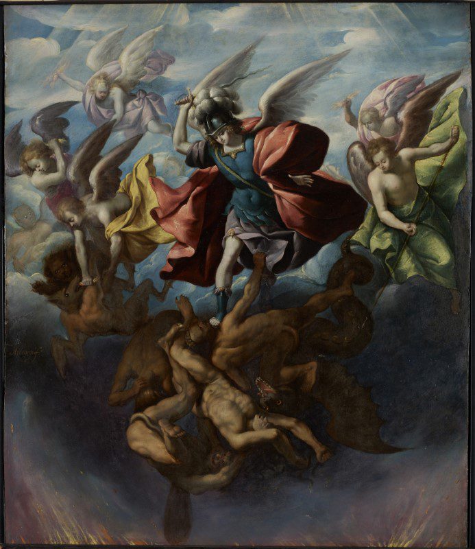 Sebastián López de Arteaga, Saint Michael Striking Down the Rebellious Angels [detail], 1650-1652, oil on copper. Courtesy of the Hispanic Society of America, New York.